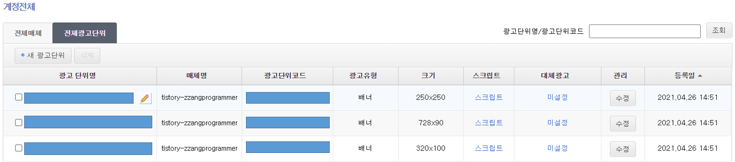 3) 전체 광고 단위 확인