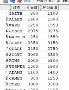 123--1. 덧셈연산자를 이용하여 모든 사원에 대해서 $300의 급여 인상을 계산한 후 사원의 이름, 급여, 인상된 급여를 출력하시오.select ename 성명, sal 급여 ,sal+300 as 인상급여from emp;Colored by Color Scriptercs 123456--2. 사원의 이름, 급여, 연간 총 수입을 총 수입이 많은 것부터 작은 순으로 출력하시오--, 연간 총수입은 월급에 12를 곱한 후 $100의 상여금을 더해서 계산하시오.select ename 성명, sal 급여, (sal*12)+100 총수입from emporder by 3 desc;Colored by Color Scriptercs 123456--3. 급여가 2000을 넘는 사원의 이름과 급여를 표현, 급여가 많은 것부..